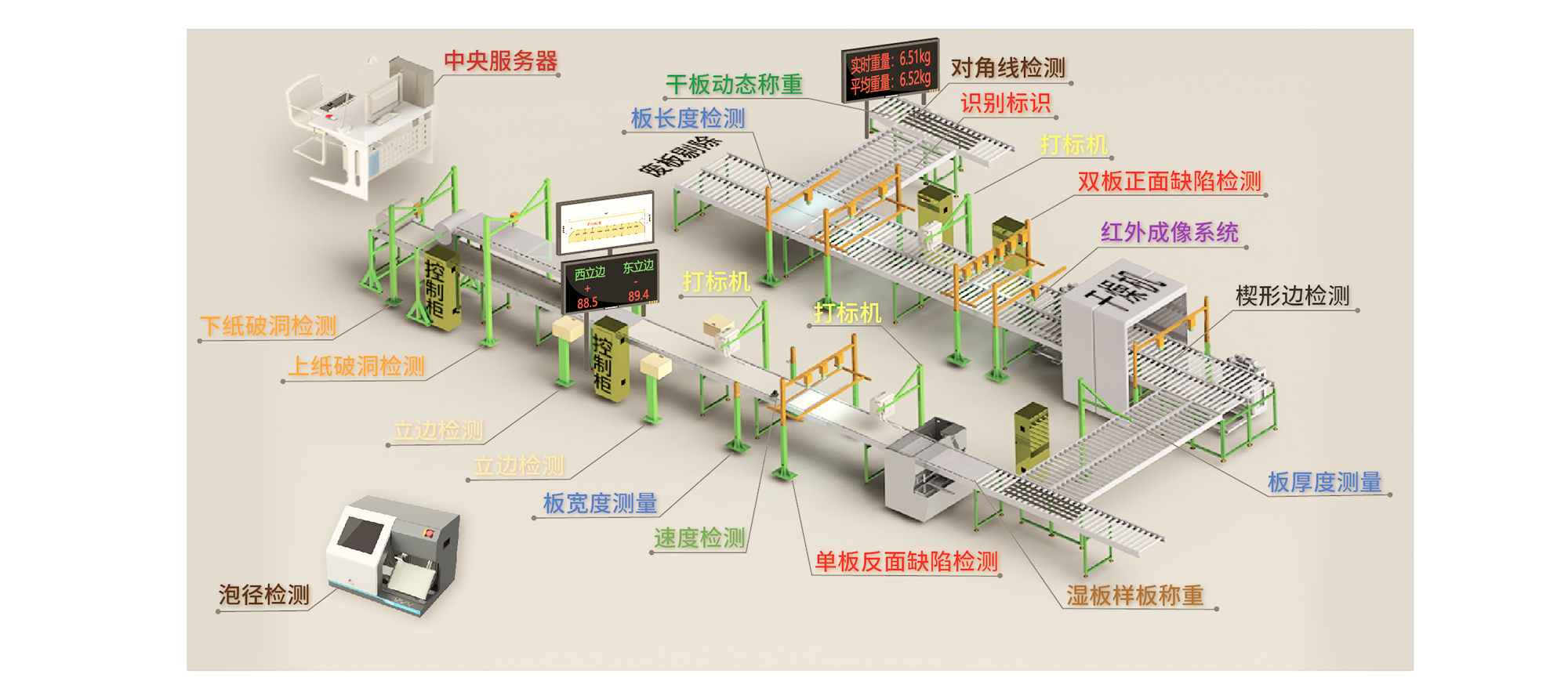 2、板形檢測(cè):石膏板寬度、厚度、楔形邊寬度、深度,對(duì)角線等。