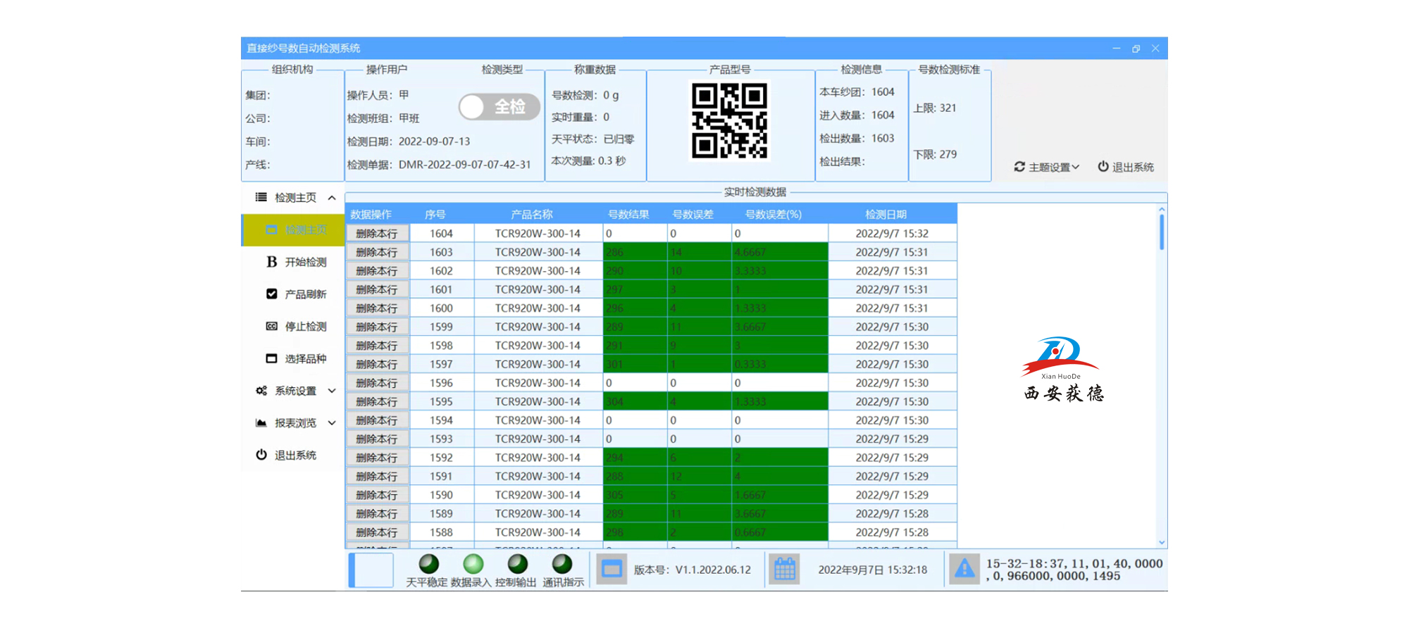 號數內圈檢測:內圈整理工利用自動檢測機械結構切割一米紗線,自動掛在天平上開始稱重,系統同時高速采集數據進行穩定判定,待數據穩定后根據產品預設的標準進行判定線密度是否合格,同時將結果顯示在主界面上,包括檢測日期、班組、產品型號、爐位號、線密度值、偏差值、偏差百分比。