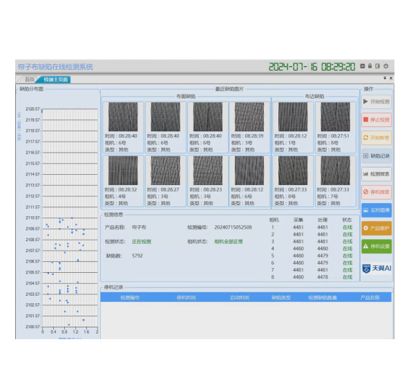 簾子布織機在線檢測使用機器視覺技術代替人工對簾子布生產過程中的布面進行全面檢測。并采用深度學習AI技術對檢測到的缺陷進行分類,可按照不同類型進行報警或者停機處理。